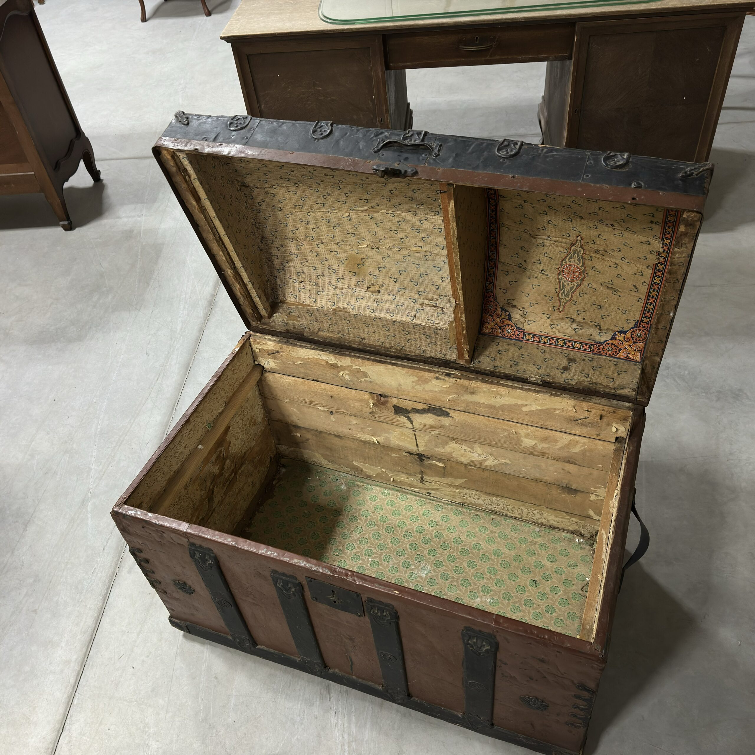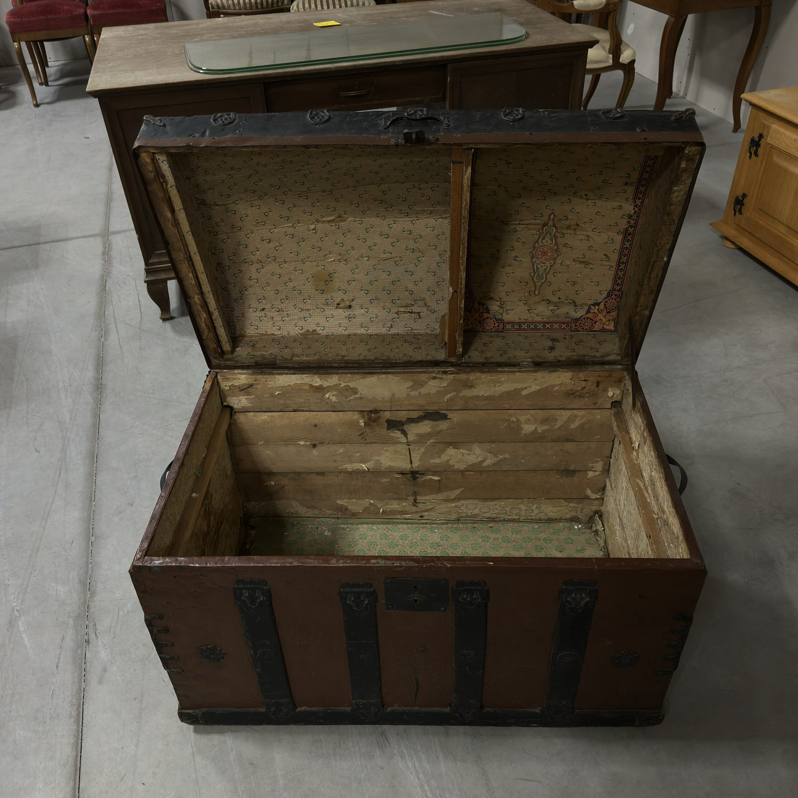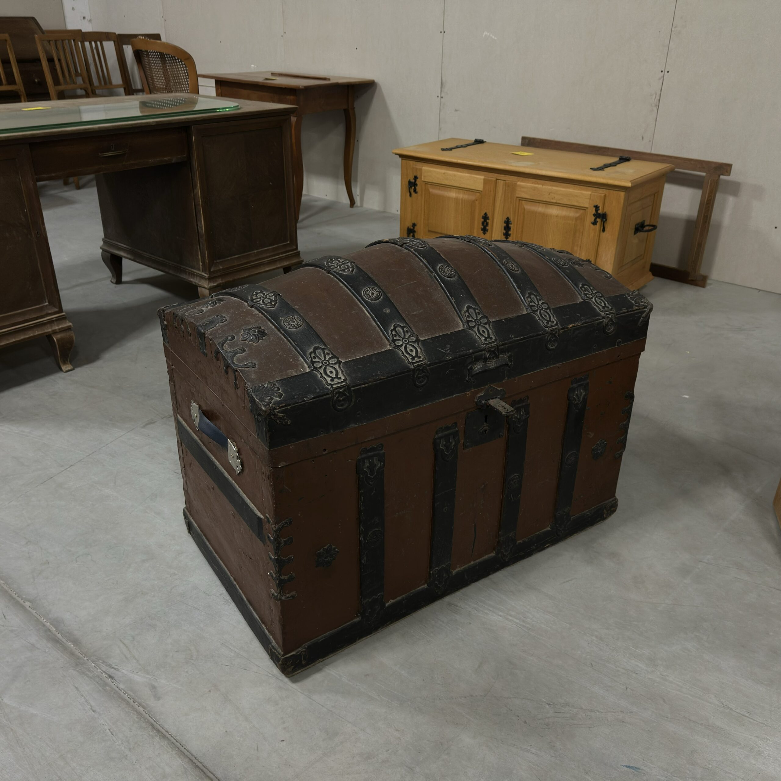 Kufer drewniany, z wypukłym wiekiem, bogato okuty metalem, zachowany w stylu historycznym. Może pełnić funkcję skrzyni do przechowywania lub elementu dekoracyjnego.
